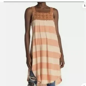Stylish tunic dress featuring wide stripes and crochet detailing. Perfect for casual outings.