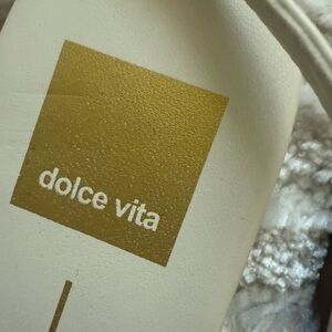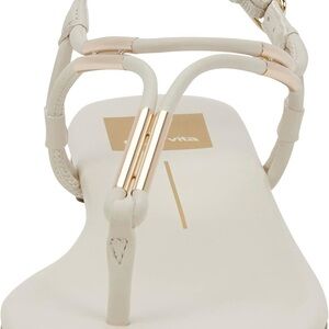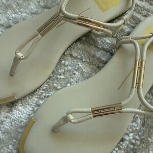 These Dolce Vita sandals feature a sleek T-strap design in a versatile cream color, perfect for both casual and dressier occasions. The sandals boast a flat sole with minimal heel height and a secure ankle strap with a buckle closure. Metallic accents add a touch of elegance to the overall minimalist design.