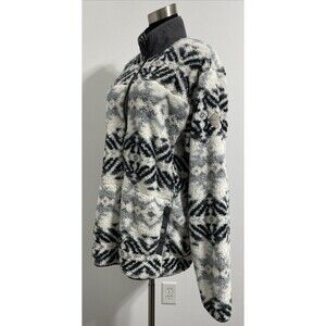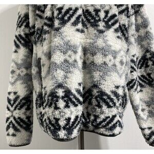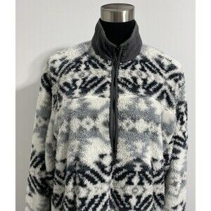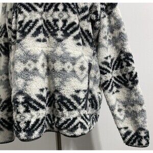 Eddie Bauer 1/3 Zip Pullover Men's TL LT Large Tall White Gray Black Fall Winter Aztec Tribal All Over Repeating Print Pattern Plush Fuzzy Ultra Soft Cozy Outdoor Hiking Camping Log Cabin In The Woods Vacation Trail Gorpcore Jacket. Pre-owned, gently used with no flaws. Please see all pictures and read the measurements. 100% polyester. Kangaroo passthrough style pocket on lower front with snap button closures on each side of the pocket openings.