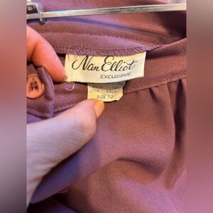 Vintage early 1980s, Nan Elliot skirt suit. Purple. Women’s size 6/8. Jacket with two front pockets. 3/4 sleeves. Two button closure. Skirt 6 button front closure. Kick pleat in the back. Beautiful condition.