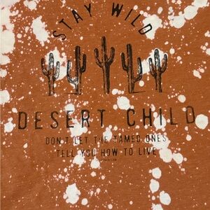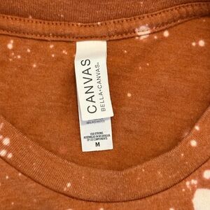 Super cute and comfy. Burnt orange color with bleach tie dye and black print.
