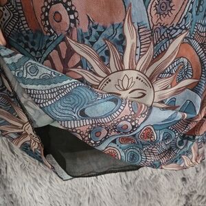 Sheer, lined mini skirt with a cute & colorful sun print. Size Small. No brand. Good used condition.