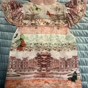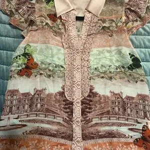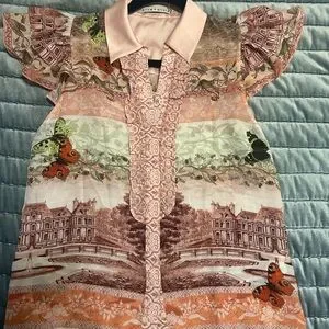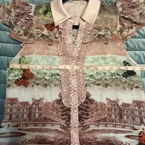 Chic blouse with a pink collar. Features a multicolor pattern with intricate designs. Short puff sleeves add elegance.