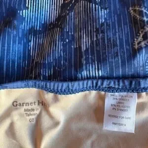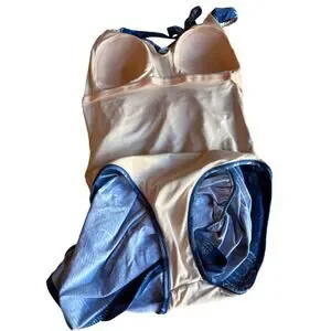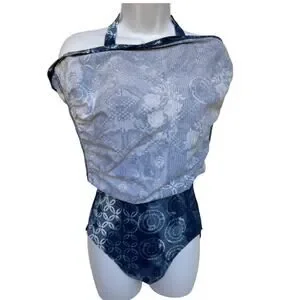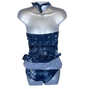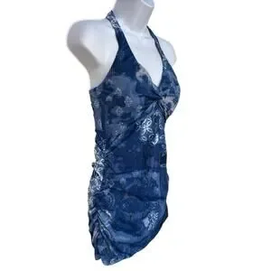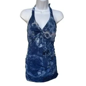 Garnet Hill swim dress in very good condition without signs of significant wear and no flaws noted. Features include a halter top with twist front and tie back, side ruching, and a fully lined interior. The beautiful print is inspired by batik and the colors of water. Measures app'x: 13 inches across waist and 13.5 just below chest. Cups are sewn in and look like B size.