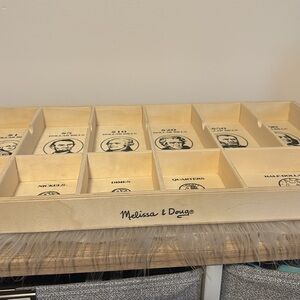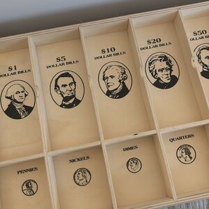 This is a barely used wooden money sorting/counting tray from Melissa & Doug. It’s from their Play Money set & has slots for $100, $50, $20, $10, $5, $1, Half Dollars, Quarters, Dimes, Nickels & Pennies.