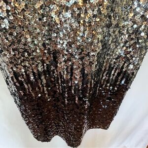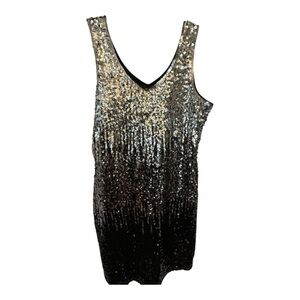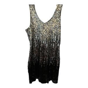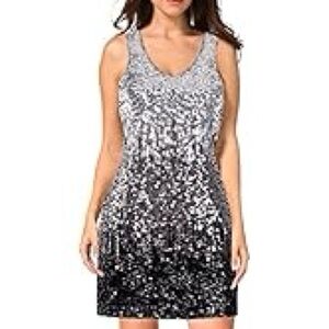 This sleeveless mini dress dazzles with its silver and black sequin design, perfect for a night out. The V-neckline and sheath silhouette offer a chic and sophisticated look. Ideal for cocktail parties, it adds a touch of glamour to any special occasion.