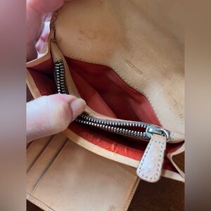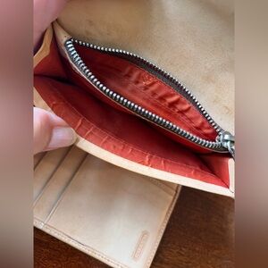 Zippered coin compartment, lined bill compartment, 8 card slots and 4 interior lined pockets. Soft leather in excellent condition.