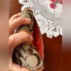This Coach wallet showcases the brand's iconic signature pattern in a sophisticated brown and tan color scheme with leather trim and full leather interior. Exterior lined pocket.