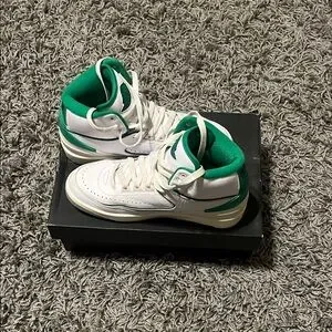 Classic Jordan Air Retro 2 sneakers. Features a sleek white and green design. Ideal for everyday style.