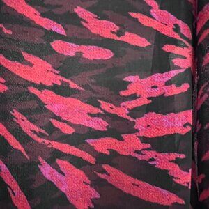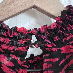Gorgeous Allison Joy blouse that's never been worn but no longer fits me! This stunning piece features a beautiful red, pink and black abstract print with romantic ruffle details - perfect for layering or making a statement.