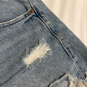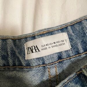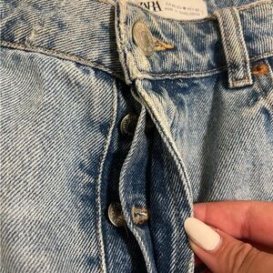 These high-waisted jean shorts from Zara feature a stylish distressed design with frayed edges and visible rips, offering a trendy and casual look. The light to medium blue wash adds a classic touch, making them perfect for a laid-back day out. Crafted from rigid denim, they provide a structured fit with a deliberately rough finish.