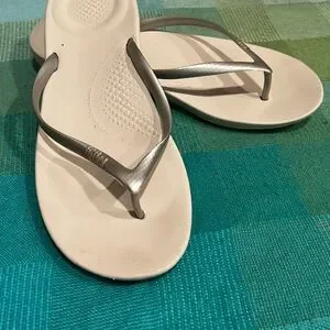 Step out in style with these chic silver flip flops. Perfect for casual outings, these sandals offer both comfort and elegance. Constructed with Fitflop’s all-day comfort tech.