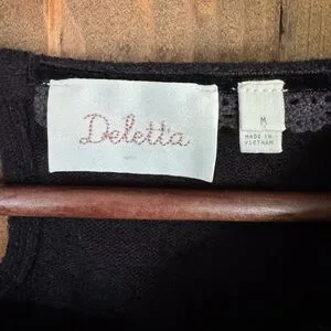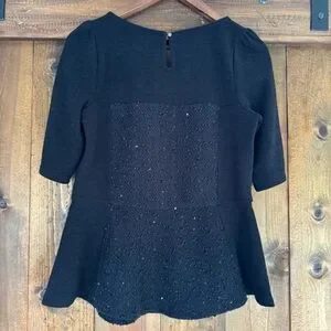 Anthropologie Deletta Boucle Shimmer Sequins Sweater in black. Size: Medium. Chest (flat): 17 inches. Length: 24 inches. Pull over styling. Back button closure. Elbow length sleeves. Peplum waist. Center panel of sequin detain on front and back. Great preowned condition.