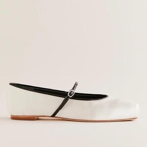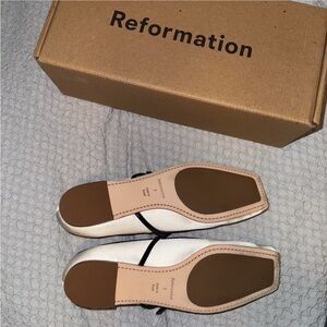 Experience the perfect blend of style and comfort with Reformation's white and black flats. Featuring a square-shaped toe and elegant black straps, these shoes offer a minimalist yet sophisticated look. Ideal for versatile wear, they promise both functionality and timeless elegance.