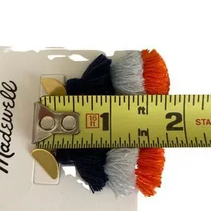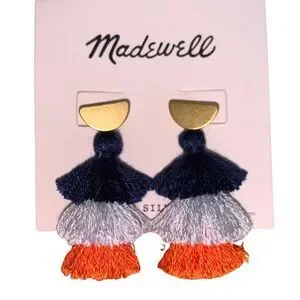 Add a pop of color and texture to your outfit with these stunning tiered tassel earrings from Madewell. Featuring three layers of soft fringe in navy, silver, and orange, these statement earrings are topped with a modern gold-tone half-moon stud. Perfect for dressing up a casual look or adding flair to an evening outfit.