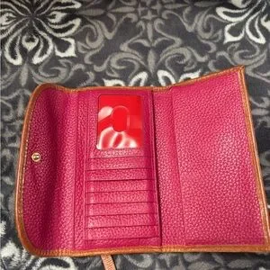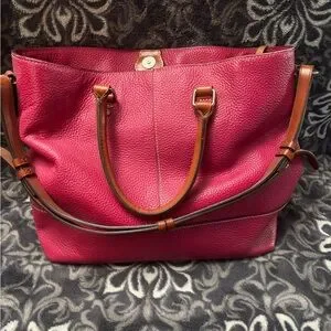 This elegant tote from Dooney & Bourke features a vibrant pink leather body complemented by brown leather handles, making it a stylish choice for any occasion. The structured design and gold-tone hardware add a touch of sophistication, while the high-quality leather ensures durability and a luxurious feel.