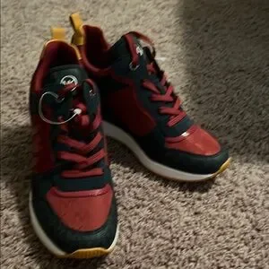 Stylish sneakers wedges featuring a bold/ logo red and dark blue design. Like new . Perfect for casual outings. Size 9