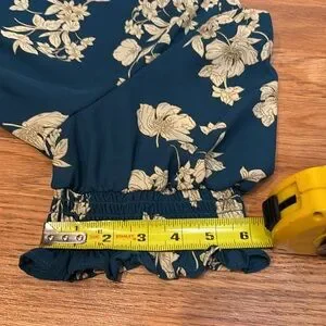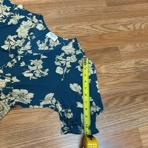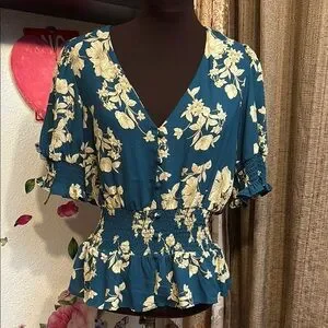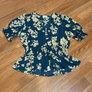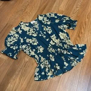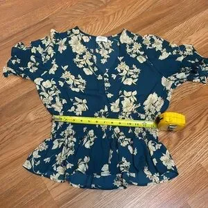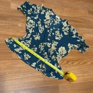 Sienna Sky dark and cream floral teal short flutter sleeve peplum blouse. Size L