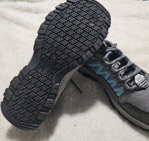 Step into comfort and durability with Skechers safety shoes, featuring a breathable gray mesh upper accented with blue highlights. Designed for work environments, these shoes boast a rugged sole with great traction. Women's 6.5 composite safety toe with memory foam. Worn once! EUC, no flaws!