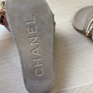 Elegant CHANEL sandals with gold chain and pearl accents. Beige base for a classic look.