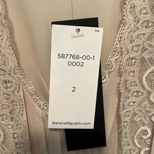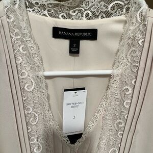 This stunning Banana Republic sundress in a cream hue is perfect for a wedding guest or cocktail event. Featuring a sleeveless design with a v-neckline, the dress boasts a pleated maxi skirt that flows elegantly. The lightweight fabric and romantic lace detailing on the bodice add a touch of sophistication to this timeless piece.