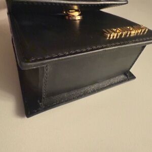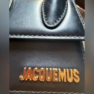 The Jacquemus Black Mini Bag is a stylish accessory that embodies the brand's minimalist aesthetic. Crafted with a structured, boxy design, it features short top handles and gold branding, making it a chic addition to any outfit. #jacquemus #bag #crossbody #minibag