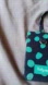 Chic luggage tag with teal polka dots. Durable and stylish for travel.