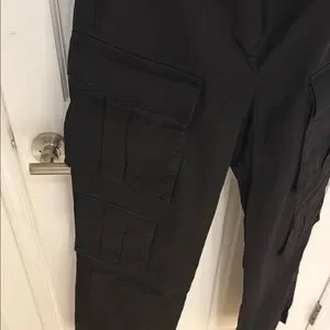 These Prada black cargo pants feature a sleek straight-leg design, offering a modern twist on a classic style. Crafted with attention to detail, they provide both comfort and sophistication for any casual occasion.