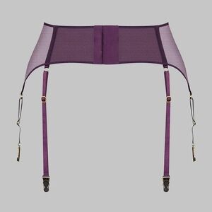 L’Amoureuse sheer mesh garter belt by Maison Close. Elegant purple orchid color. Six fully adjustable, non-removable straps. Hook-and-eye closure in back. Designed to pair with matching sets or wear as a statement on its own.