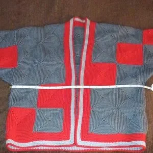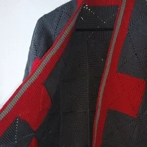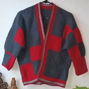 Woman's 3/4 sleeve handmade sweater. One of a kind vintage. Crop style. Featuring a bold red and gray design. Perfect for adding a pop of color to your wardrobe. This sweater may fit a S, M or L. This piece is thick, bit heavy and will have some stretch. Only flaws can be stitched (see photos) selling as is. P to p 20 length 22, this is kind of a dolman sleeve so measuring p to p below sleeves(see photo).