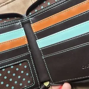 Stylish leather wristlet featuring a unique horse design. Blue and brown colors with a touch of cream. Perfect for carrying essentials.