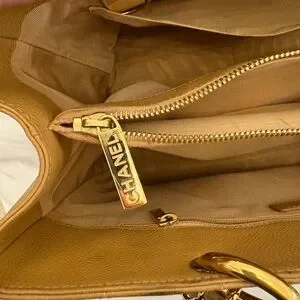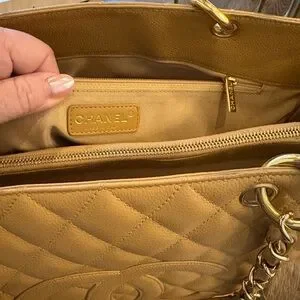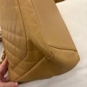Chanel Grand Shopping Tote is Preloved but in great condition. Relaxed Sides, slight rubbing on most corners. Handles show light water spot and some light color transfer on the underside of handles. The way it’s carried you don’t see the color transfer. *If fact when the bag is carried it looks great, just the relaxed corners noticed.