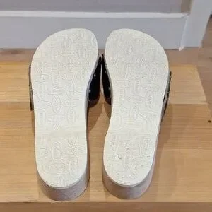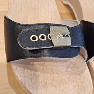 Vintage Dr. Scholl's wooden clog / shoe slides. Excellent condition (see photos for condition). Wood soles with black leather strap. Adjustable gold/brass buckle. Made in Italy. Size 7 (U.S.). Freshly scrubbed & sanitized and ready for you!