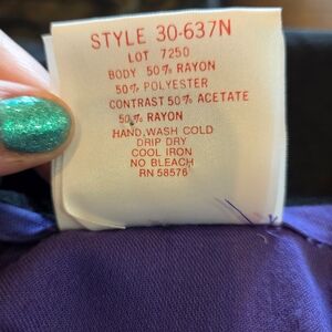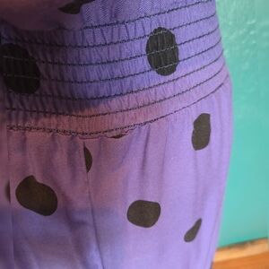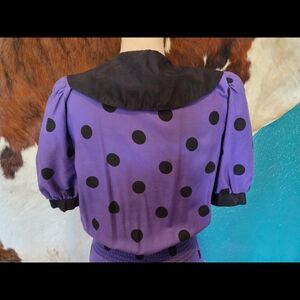 Step out in style with this elegant purple dress featuring bold black polka dots and bow . Perfect for any occasion. Has been well loved. The fabric has normal wear from being washed. Has been repaired on the waist in the back. Has shoulder pads