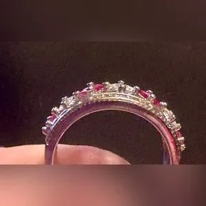 This stunning ring features vibrant red rubies and sparkling diamonds, set in a luxurious silver band. Perfect for adding a touch of elegance to any outfit.