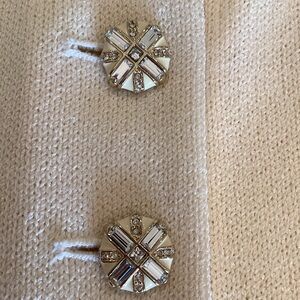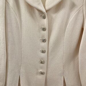 This cream blazer from St. John Evening features a tailored silhouette, collar and is crafted with clean lines and a flattering fit. Sleeves are embellished with small gold pleats and beautiful jeweled buttons, along with six of the same jeweled buttons on front of blazer. Front of blazer also has two small embellished pleats at hem bottom. This jacket is in excellent condition and was only worn twice. Measurements:shoulder to hem 24”, sleeve 22”, bust pit to pit 18”. There was a small pull under the right arm that has been repaired and is not noticeable when jacket is on ( price reflects this small imperfection).