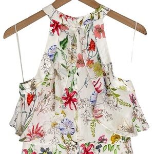 Tiered ruffles float down to a dramatic high low hem on this ethereal maxi dress fashioned from floral print silk georgette.
