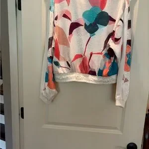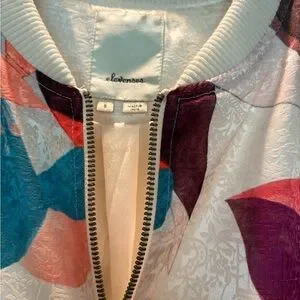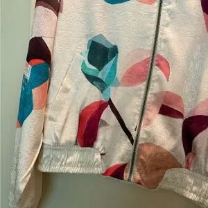 This stylish bomber jacket from Elevenses made for Anthropology features a soft white and pink color palette, perfect for a contemporary look. The ribbed cuffs and waistband add a classic touch to its modern design. Ideal for layering, this jacket effortlessly combines comfort and style. Smoke Free Home. Excellent used Condition