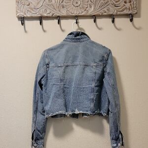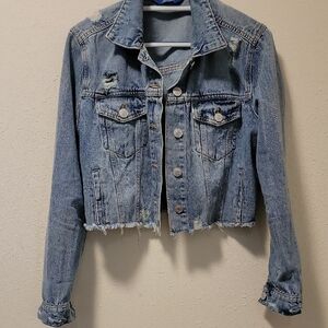 Cropped Blue Denim Jean Jacket with Distressed Hem