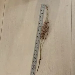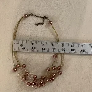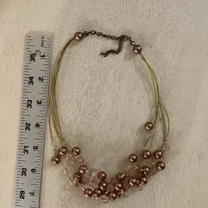 This elegant necklace features a stunning combination - 5 layers of clear pinky and copper tone beads, with small silvery bead accents; strings are coppery gold tone. Clasp is copper tone. The delicate design is both timeless and versatile, making it a must-have accessory.