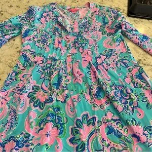 Embrace a casual, resort-ready look with this Lilly Pulitzer sundress, featuring a scoop neckline and elegant bishop sleeves. The dress showcases a pleated design in vibrant pink and purple hues, perfect for a relaxed day out. Its long sleeves and flowy silhouette make it an ideal choice for a stylish yet comfortable ensemble. Used only once !