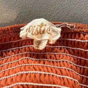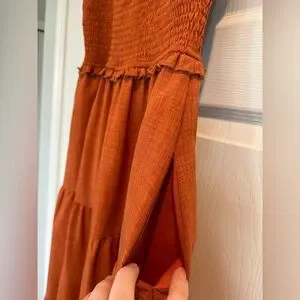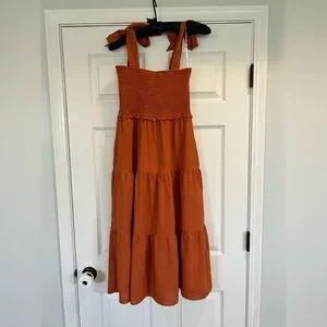 Stylish rust orange dress with tiered design and tie straps. Perfect for casual outings. The straps come undone and are able to tie to your liking. This dress also has pockets.