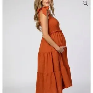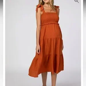 A solid maternity midi dress featuring smocked bust, self tie bow straps and tiered skirt. Skirt is double lined.