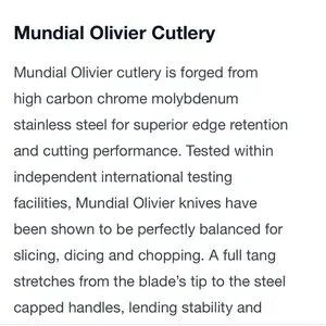 Forged cutlery by MUNDIAL, premium quality knives. 4 serrated steak knives and 1 fish. Also included w this bundle are 3 grapefruit breakfast knives. Hand wash and dry. These knives are new without tags or box. Selling because I bought 2 ages ago and the 4 I use daily are enough.