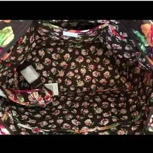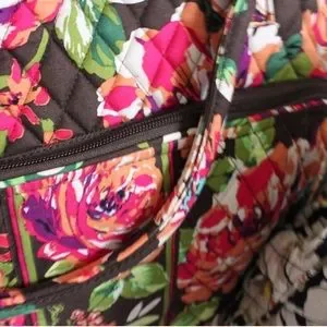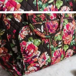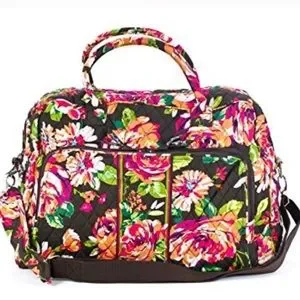 This Vera Bradley travel bag features a striking pink and orange floral pattern on a quilted fabric, offering a stylish and functional option for your travels. Its structured design provides ample space for essentials, making it perfect for weekend getaways. The double carrying handles ensure comfortable transport, blending practicality with a touch of elegance.
