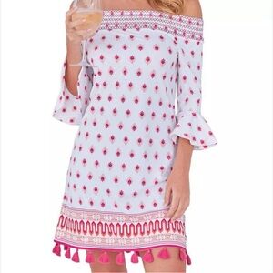 This Off The Shoulder Cabana Life Dress is so comfortably stylish, you'll never want to take it off! With a loose smock fit and off the shoulder peplum sleeves, this dress will look great alone or over a Cabana Life swimsuit. Plus, the tassels on the bottom add a fun flair that's just begging for a twirl! Like all Cabana Life clothing, it blocks up to 98% of the sun's rays with UPF 50+ sun protective material.