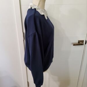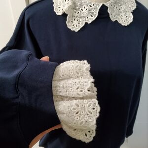 Elegant navy sweater featuring a delicate white lace collar and cuffs. Perfect for a chic and cozy look.