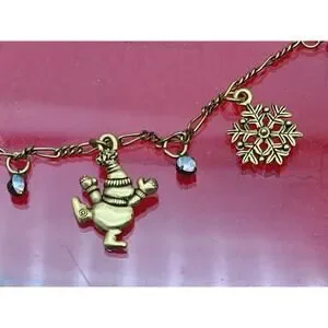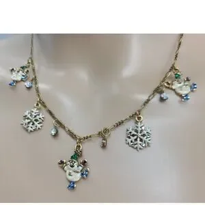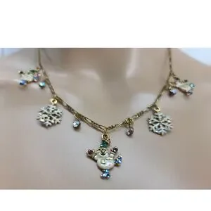 Vintage Anne Koplik Snowman & Snowflake Charm Necklace Brass Gold Tone Chain. The necklace includes white enamel snowmen with multicolored crystals, snowflake charms with blue crystals and faceted clear crystal accents. The chain is an antique brass color chain. This is a holiday-themed piece, suitable for festive occasions. The Anne Koplik brand is known for its handcrafted jewelry, made in the USA. Hang tag is attached. The necklace measures 18" long with 2 extra jump rings on the chain so that it can be worn at different lengths 16 1/2", 17 1/2" or at the 18" length. Weight 13.5 gm. It is in very good condition. No missing crystals but one clear crystal is set a bit sideways. They are pronged and glued in. Clear crystals are clear, not cloudy. The lobster clasp closure is in good working order. Very nice collectible piece. Anne Koplik includes Swarovski Elements, semiprecious stones, solid brass, antique glass beads, and exclusive hand enameling. Lead and nickel free.