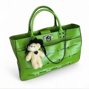 Make a bold statement with this vibrant vintage Anne Klein tote bag! This eye-catching purse comes in a striking lime green color, featuring cool stud detailing, and subtle crocodile-embossed texture on the trim. The zippers have the cutest lockets on them!! The top handle design and spacious interior make it both stylish and practical. It even comes with an adorable little teddy bear charm attached (can be removed)!