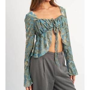 The Willa Tie Front Floral Top by Emory Park showcases elegance in a stunning sage teal color. This women's top features long sleeves with a slight bell and is crafted from 95% polyester and 5% spandex for a comfortable fit. The woven material with some stretch offers a shirred bust with lining, perfectly complementing the floral pattern. It features a functional tie front closure, making it ideal for music festivals or a chic Valentine's Day outing.